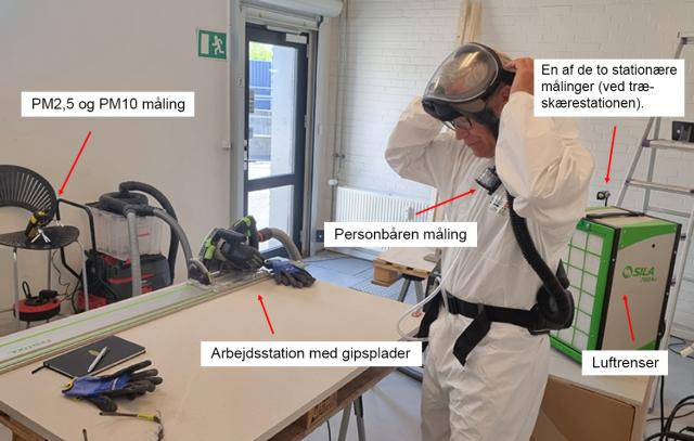 Der blev skåret 150 snit i træ og 80 snit i gips, og støvniveauet blev målt både stationært og personbåret – altså lige i den zone, hvor håndværkeren indånder luften.