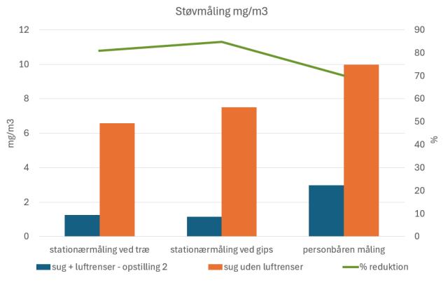 | Stationær ved træ | 6,57 mg/m³ | 1,25 mg/m³ | 81% |