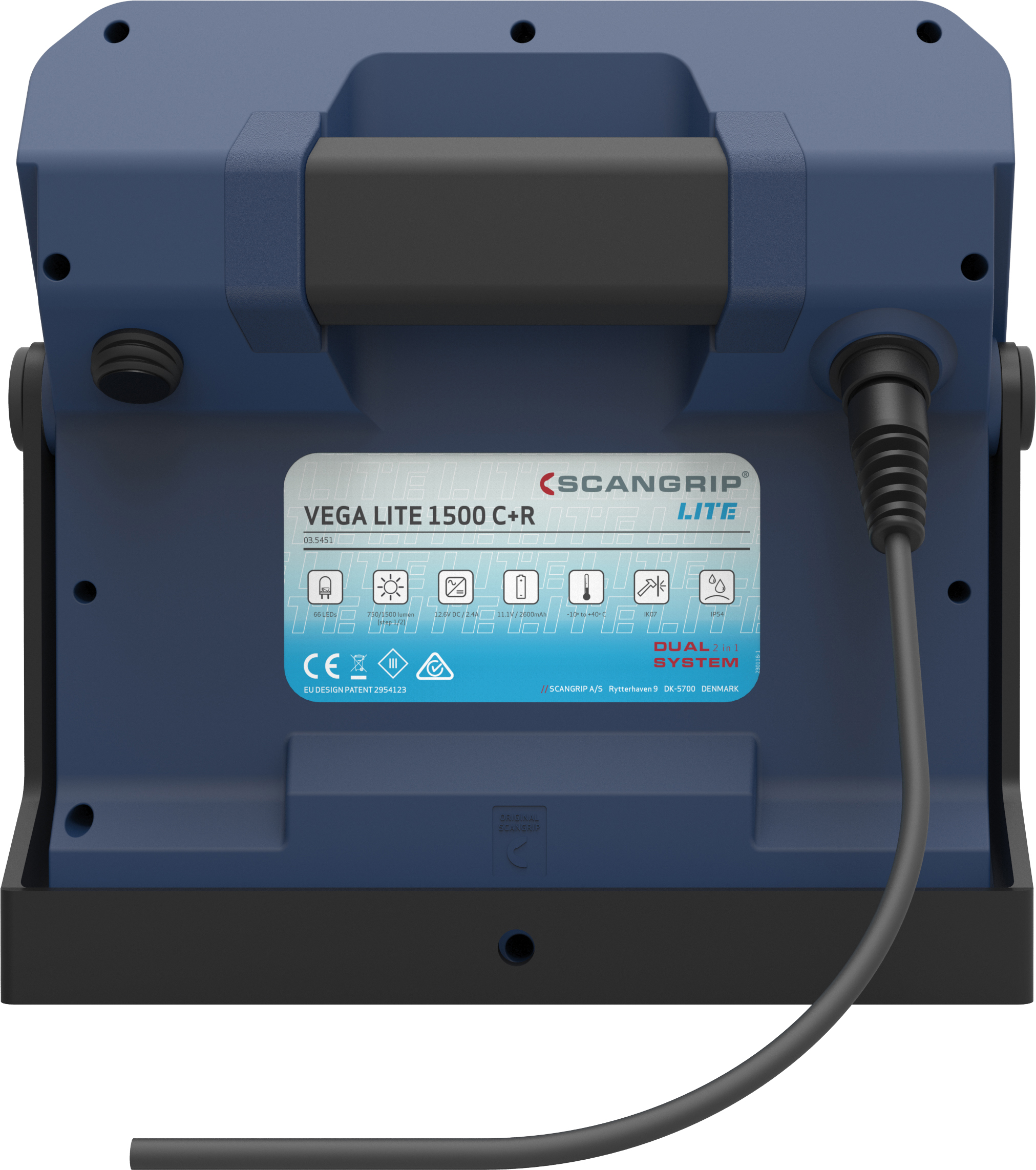 Lampen har integreret håndtag og en mulighed for støttefod som kan monteres på SCANGGRIP-stativet.