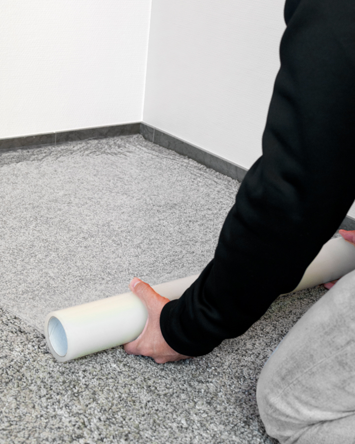 Denne beskyttelsesfilm er lavet af PE-plast og velegnet til bløde overflader, såsom tæppebelagte overflader (dog ikke anbefalet til tæpper af uld eller lang luv). Den selvklæbende overflade gør den nem at rulle ud og montere.