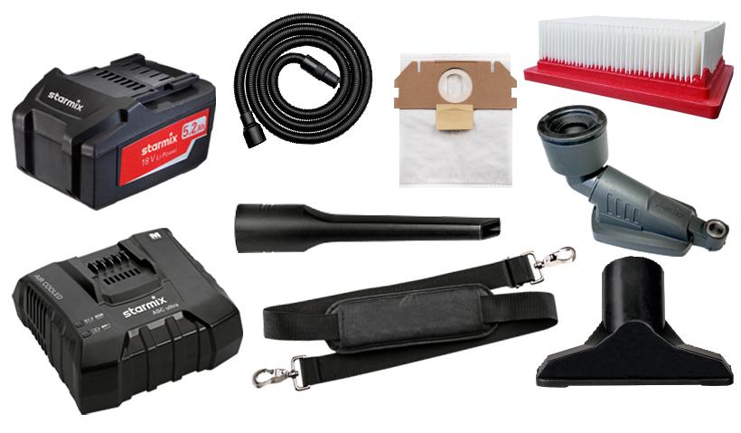 | Leveres med | 2 batterier - 18V, 5.2 Ah, oplader, 3 m slange Ø27 mm, Mundstykke 125 mm, Fugemundstykke, Bæresele, Filter, ”L”-klassificeret, Støvpose og Bohrfixx |
