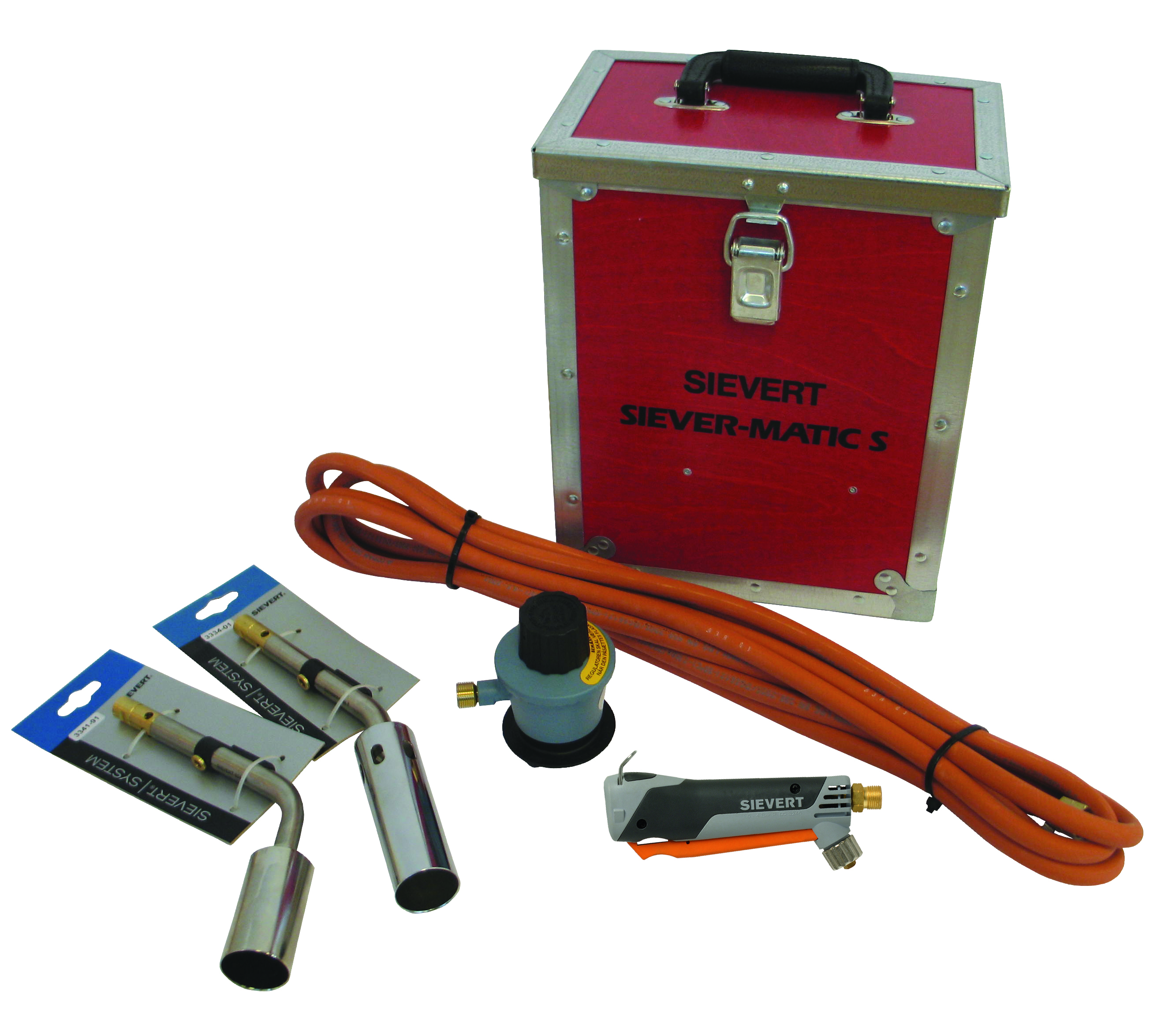 Sievert Promatic S krympesæt. Tele-montørsæt. Bestående af: Håndtag (3366), varmluftbrænder Ø38 (3334), blødflammebrænder Ø38 (3341), blødflammebrænder Ø28 (3347), højtryksregulator (3066), 4 m HT gasslange med fittings (22603-04), tool box (720100).