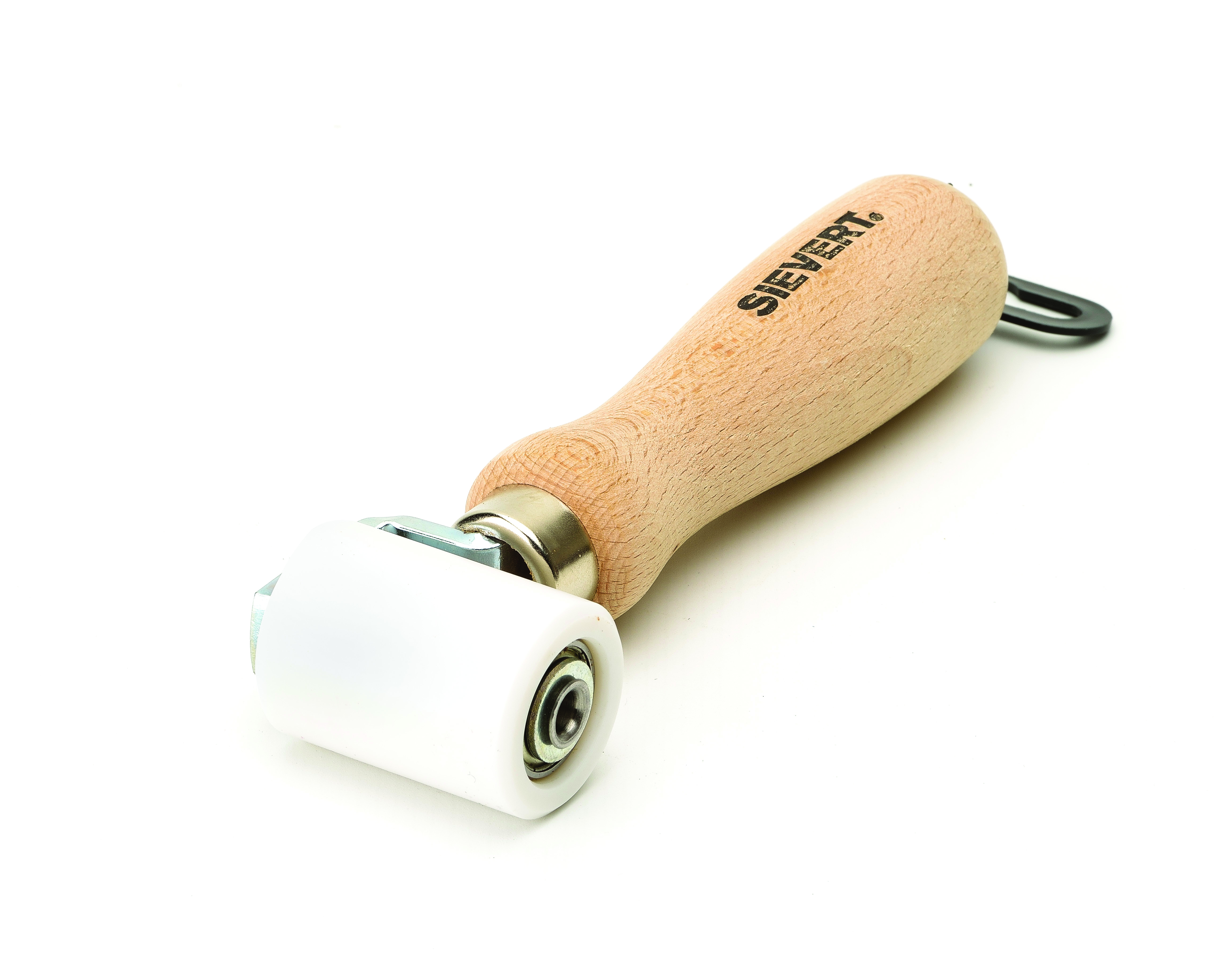PTFE-ruller til overlapsvejsning i meget hårde og seje membraner såsom polyolefin. To letløbende kuglelejer, vinkelakse, ergonomisk træhåndtag for max tryk, fastgjort i én side