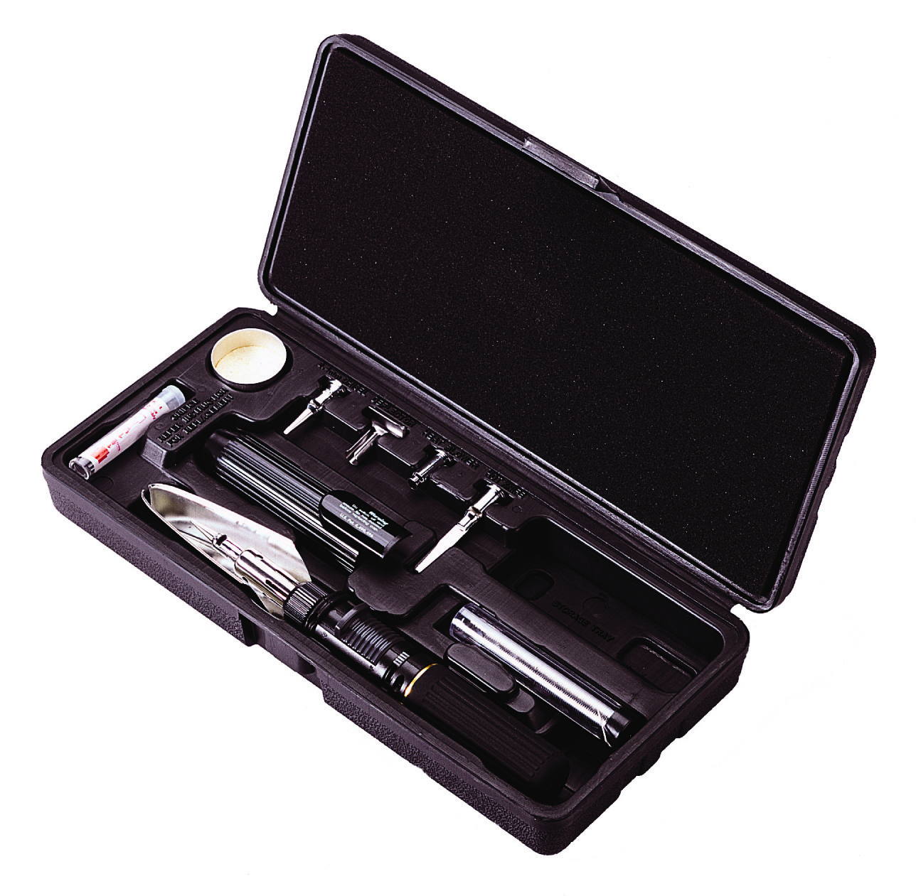 Leveres komplet i æske indeholdende konisk spids 1,6 mm, mejselspids 2,4 mm, varmluftmundstykke med tilhørende reflektor til krympearbejde, kniv, loddetin, rengøringssvamp, varmebeskyttelse og ekstra mundstykke. Til fx reparation af biler, TV og radio, smykker, elektronik og air condition.