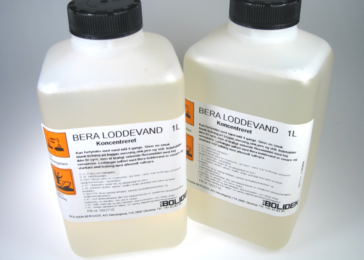 Koncentreret loddevand til lodning af tagrender og andre dele af kobber, stål m.m. Indhold 1 l.
