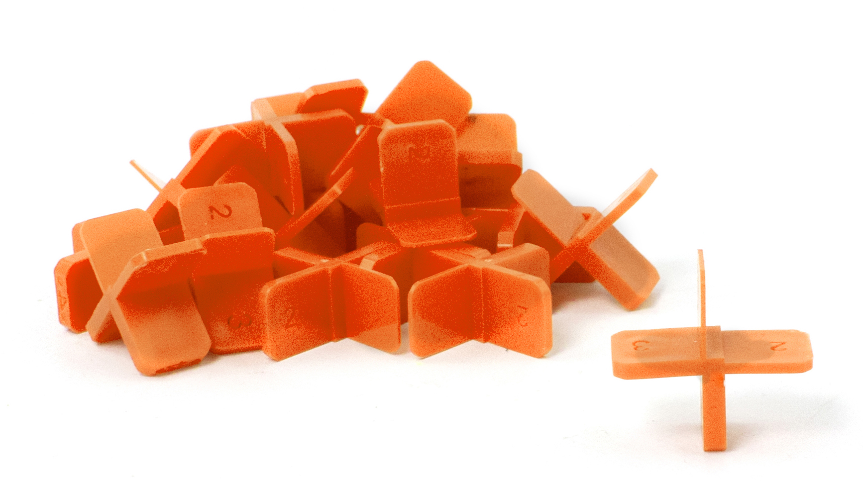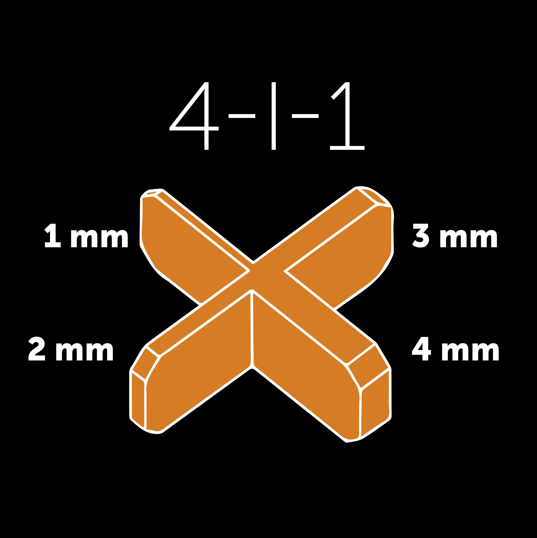 Fugekryds af polypropylen til at sikre en jævn fugebredde ved fliselæsning. Har fire ben med tykkelse på hhv. 1, 2, 3 og 4 mm. Fugekrydset fjernes, når fugen er hærdet. Kan genanvendes.