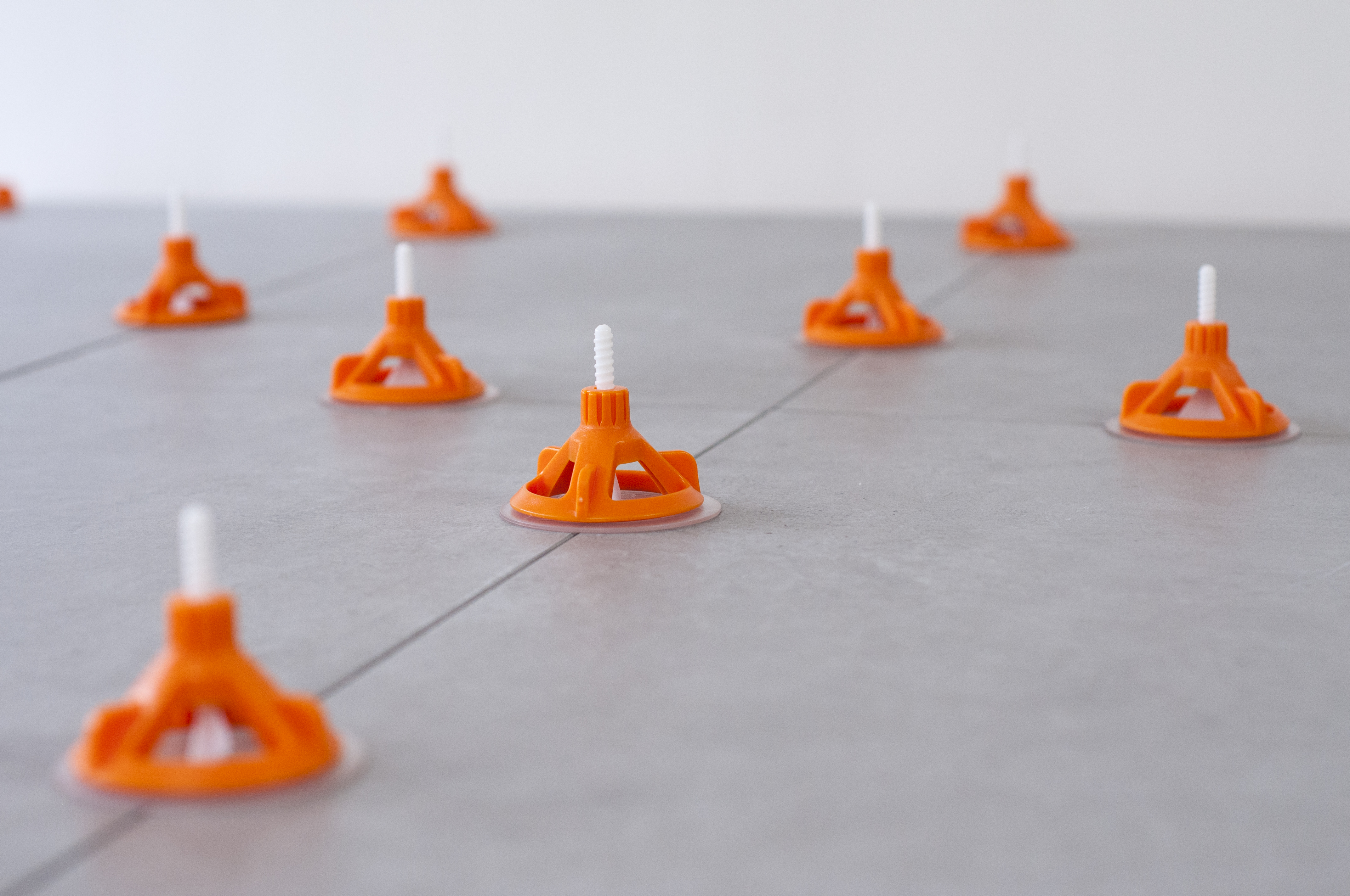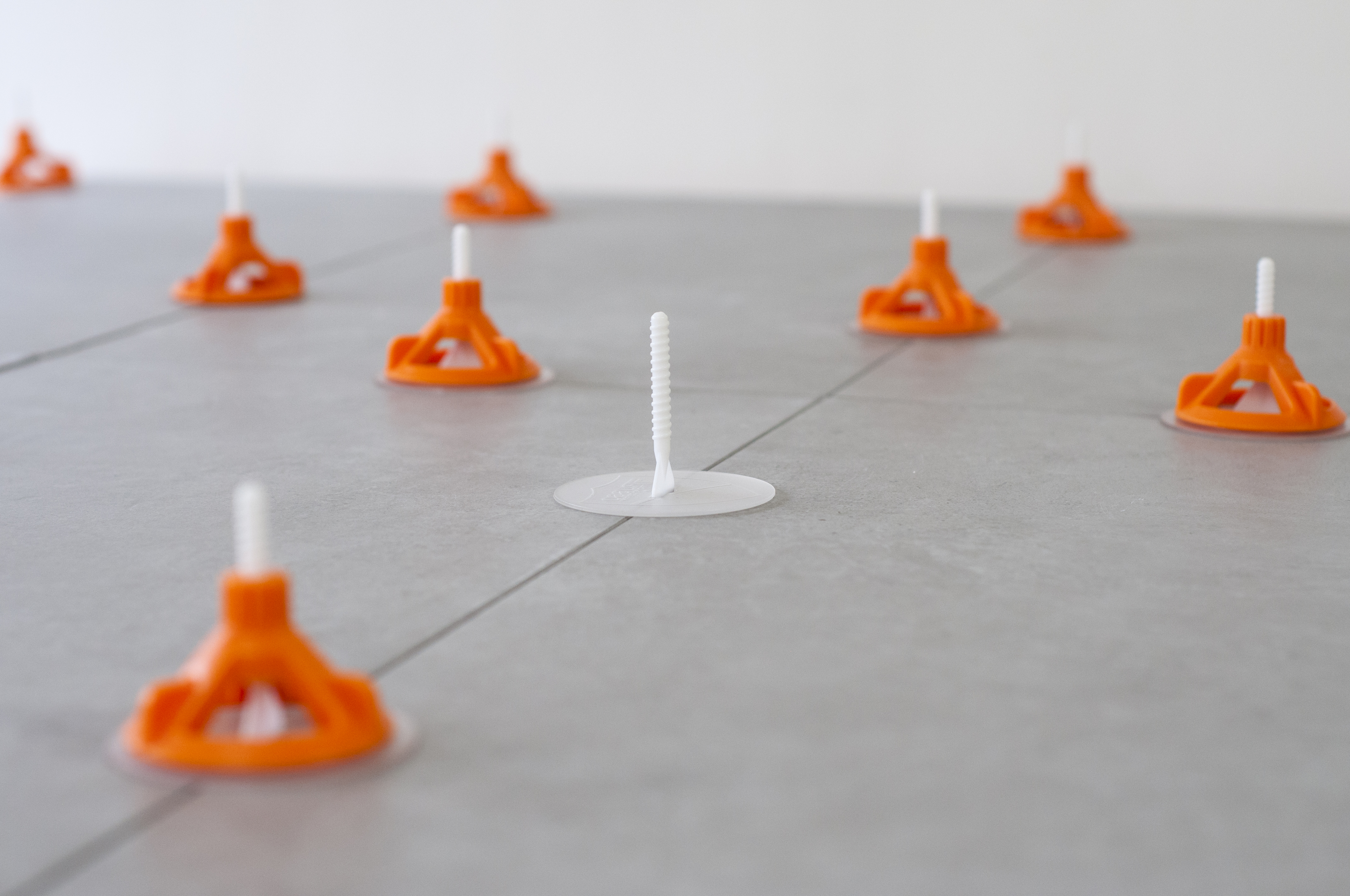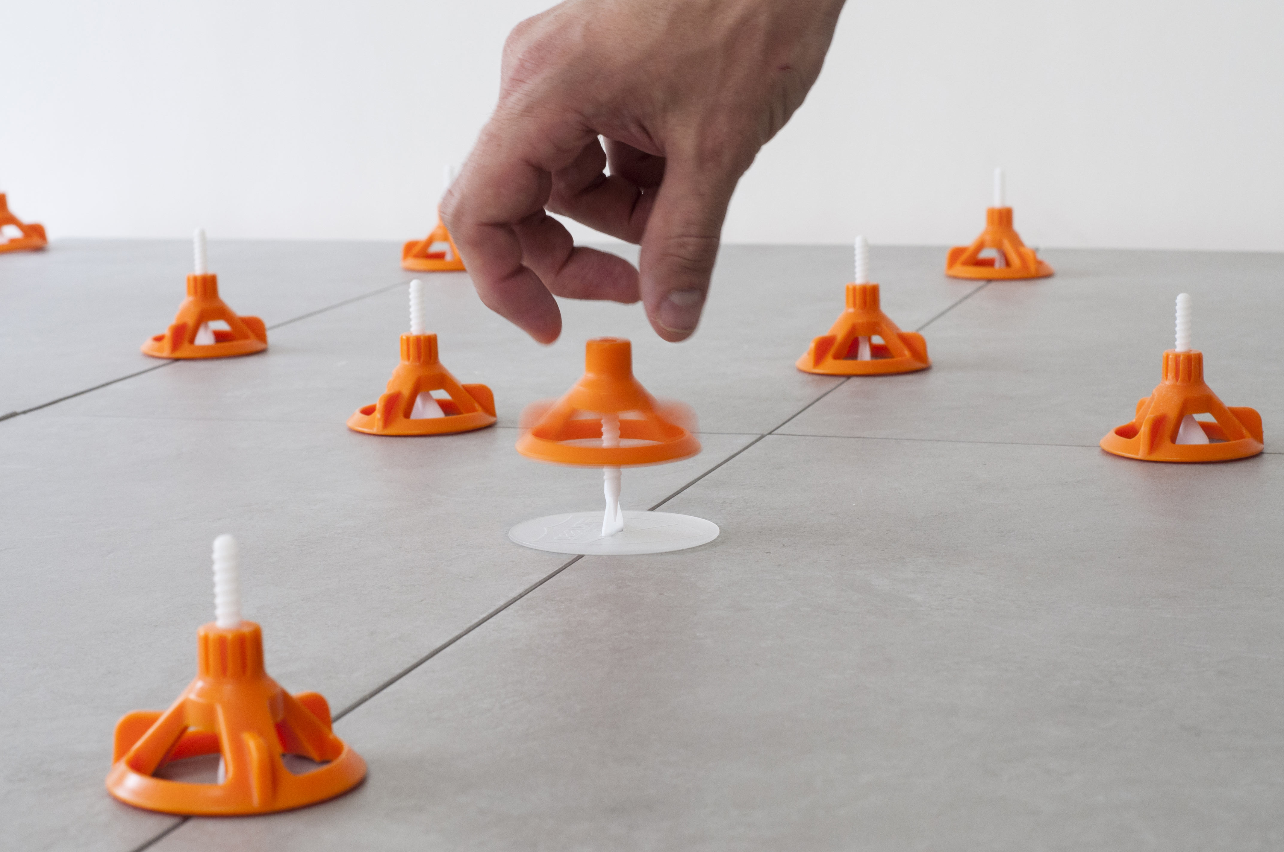 Spin Level monteres hurtigt og uden værktøj med høj præcision. Systemet består af tre dele: Niveauskrue, niveauhat og niveaubrikker (både hat og brikker kan genanvendes).