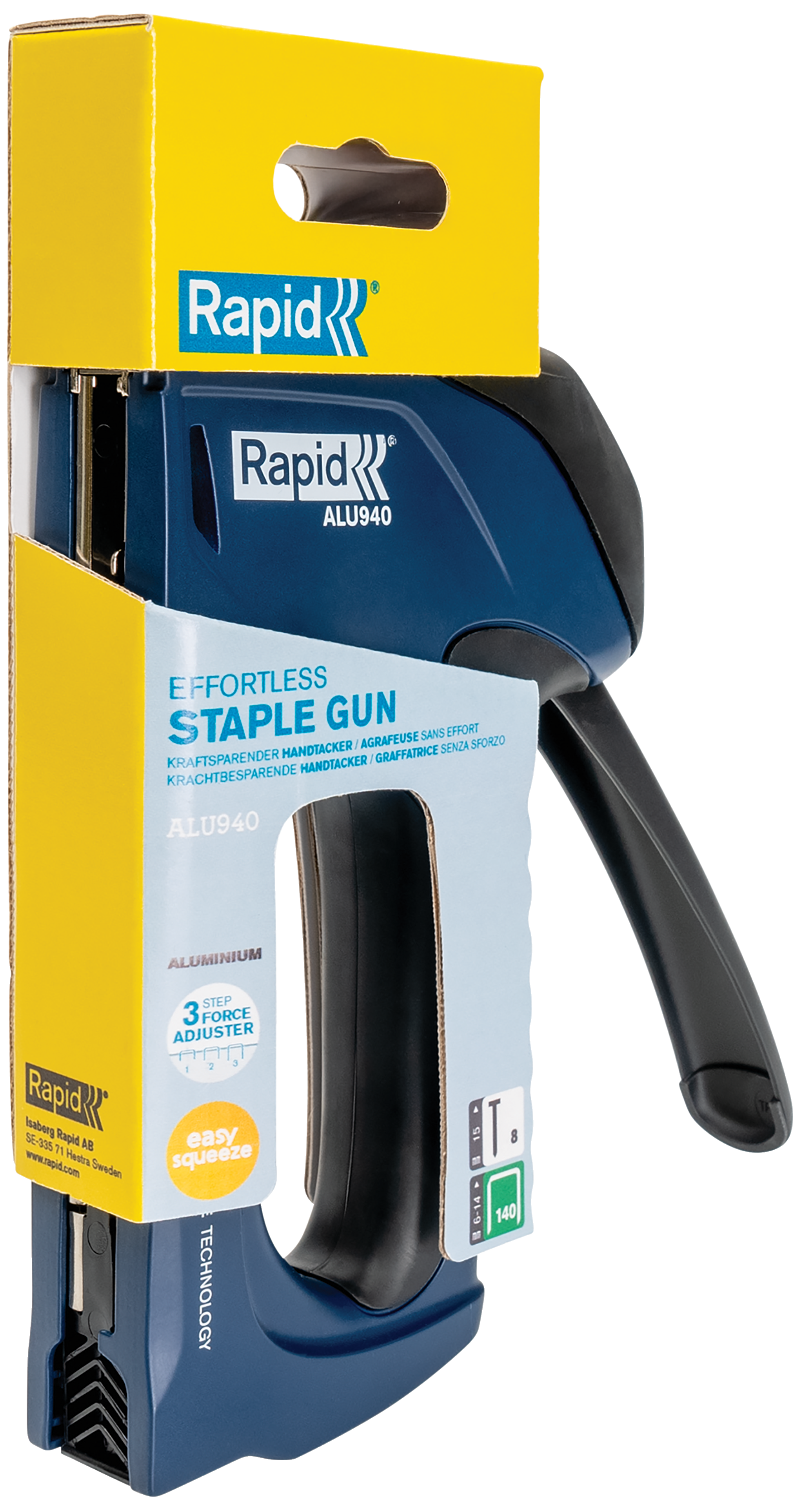 ALU940 er en nyudviklet, revolutionerende hæftepistol, som henvender sig til gør-det-selv-brugere, der har brug for et apparat på professionelt niveau. Pistolen er op til 65 % nemmere at affyre i forhold til almindelige hæftepistoler. Det skyldes Rapids nye patenterede Powercurve®-teknologi, som får håndtagets kraft til at følge håndens naturlige kraftkurve nøjagtigt. Det betyder, at pistolen anvender brugerens styrke optimalt, så der spares energi, og brugeren bliver mindre træt. ALU940 kan bruges regelmæssigt til opgaver, som f.eks. fastgøring af tyndere brædder eller masonit eller materiale, som f.eks. isolation, fugtbeskyttelse, plastikindpakning, mærkater, pap, papir eller andre elementer, der kræver effektiv fastgørelse.