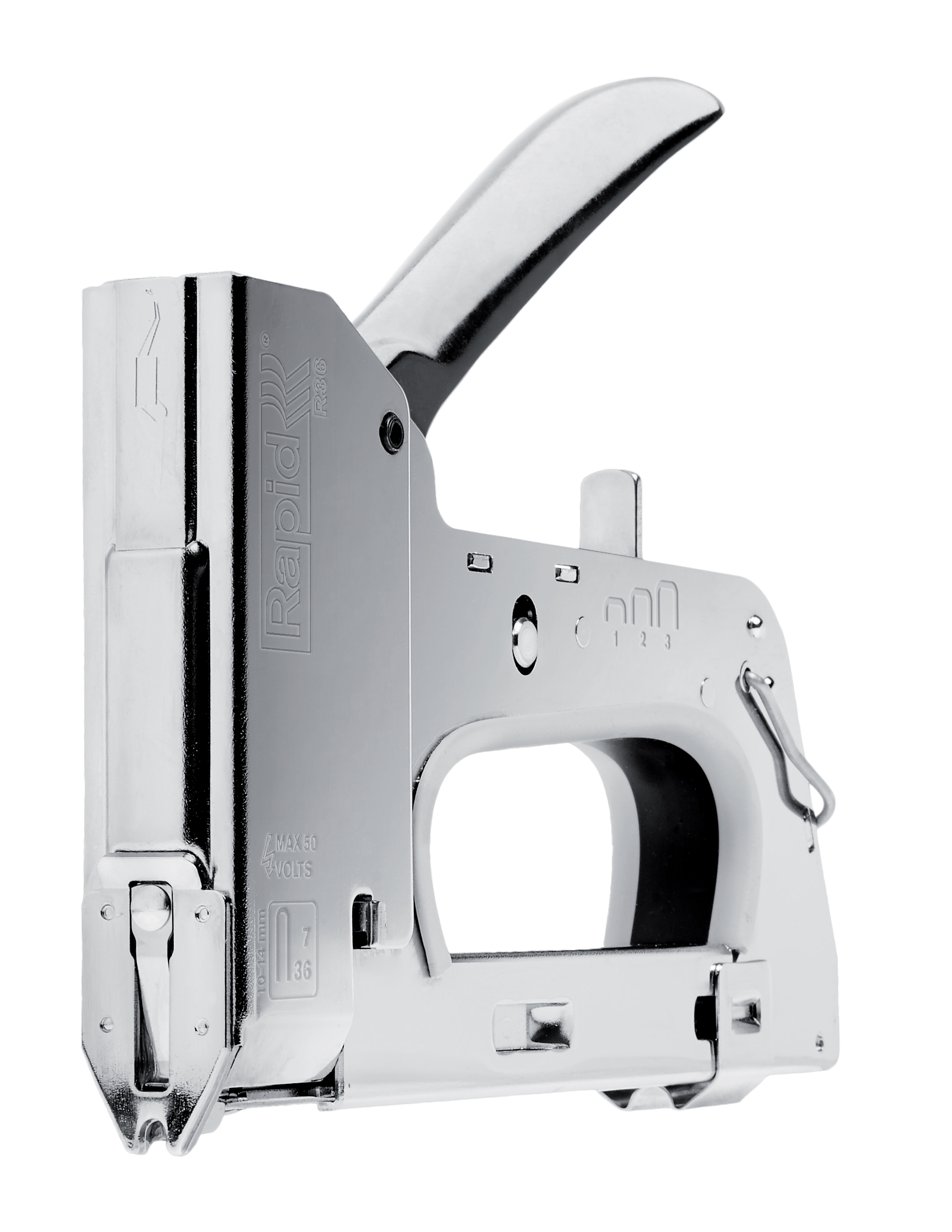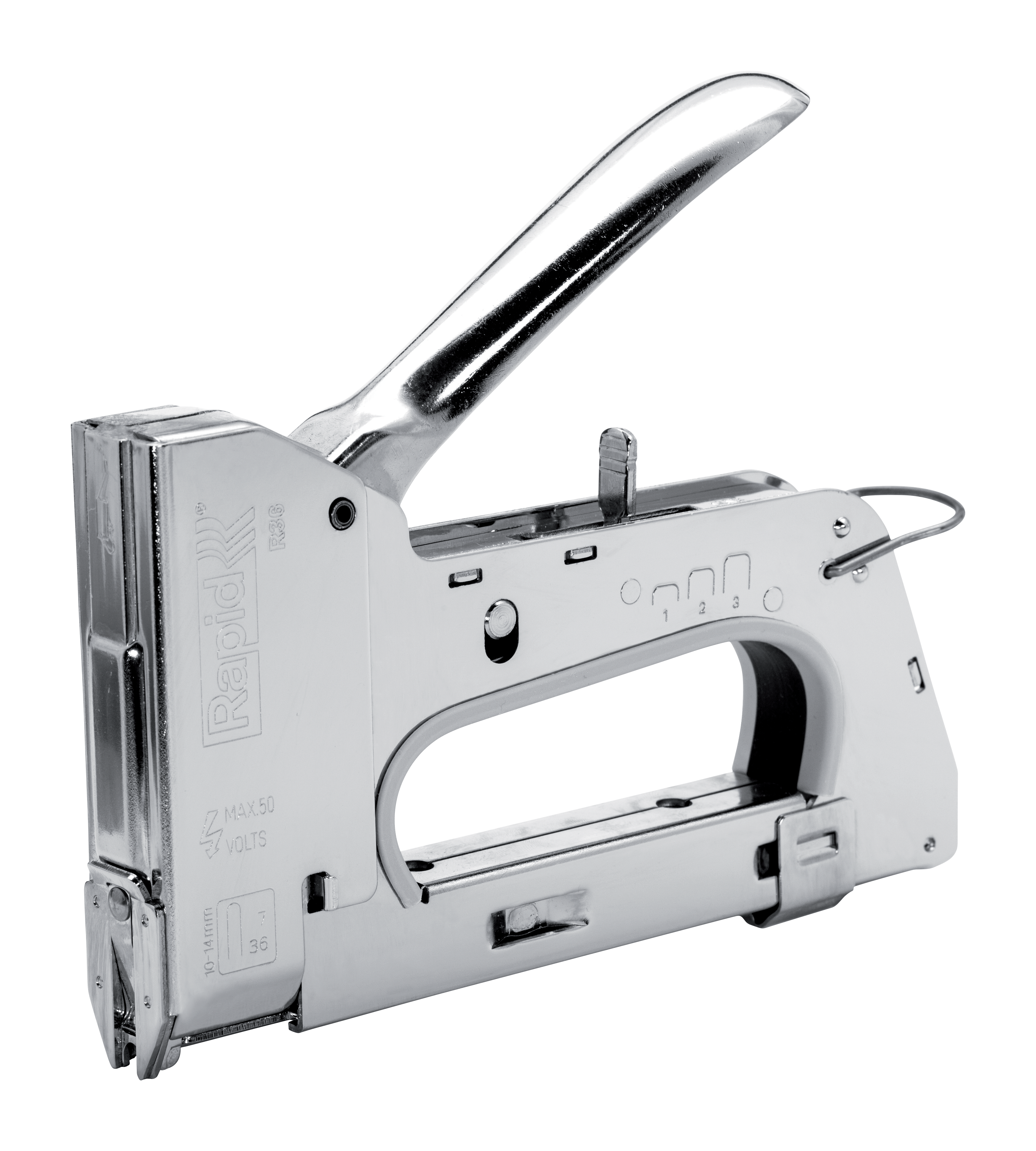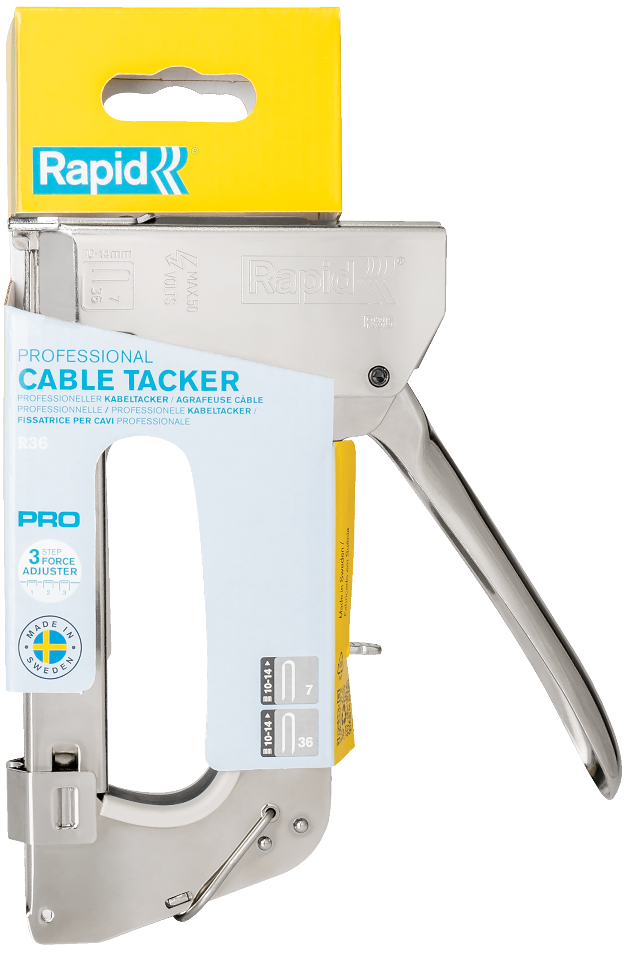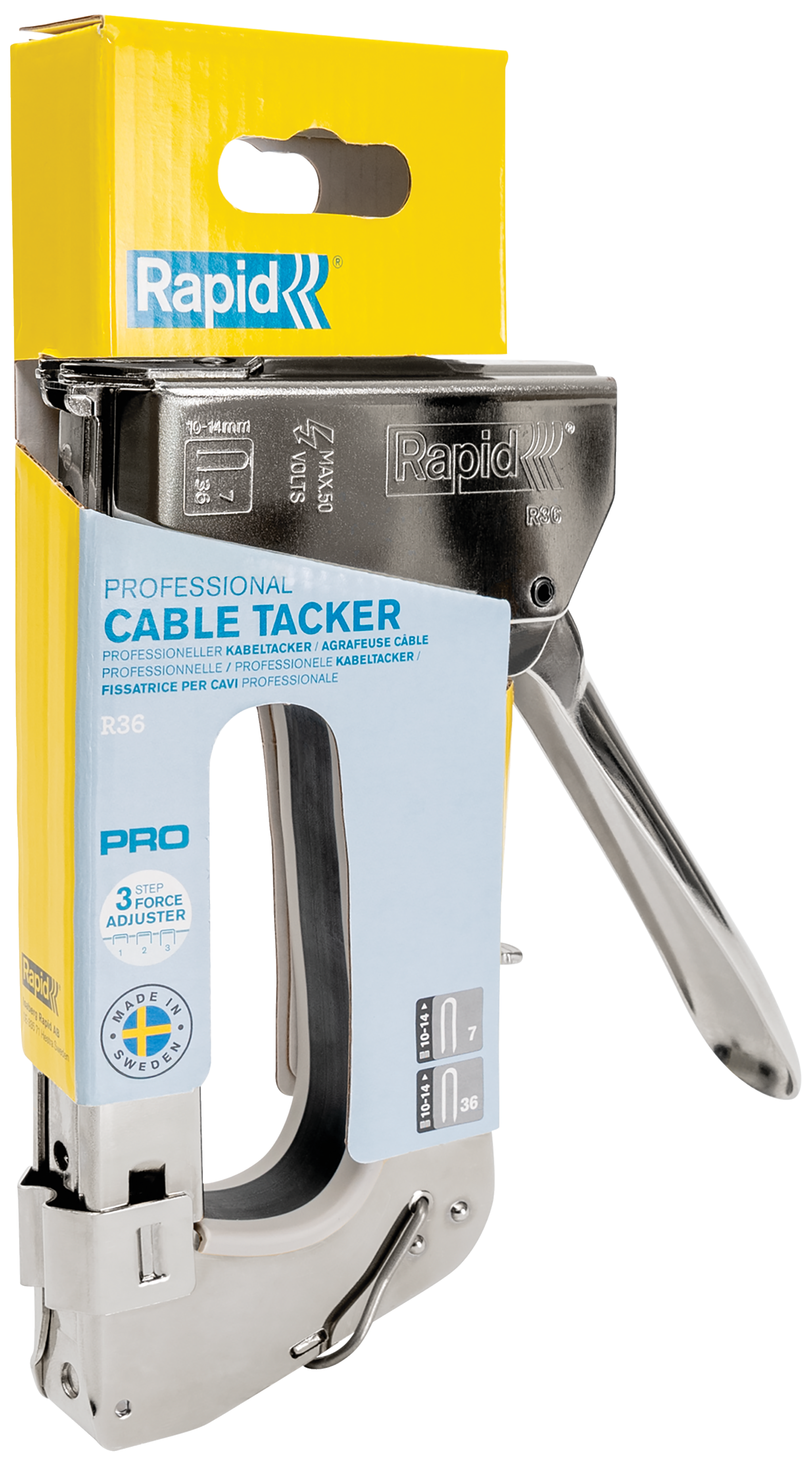 Unik, overlegen kabelhæftepistol, som er ideel til afvekslende og krævende professionelt arbejde og præcisionsopgaver. R36E er særligt designet til lavspændingskabler på op til 6 mm i diameter og har en ny, patenteret aftrækker, som er nem at anvende og har justerbar styrke i 3 trin, så der kan tages højde for materialets hårdhedsgrad eller kablets tykkelse. Denne funktion gør også R36E 40 % nemmere at håndtere. Ideel til regelmæssig, professionel brug ved fastgøring af lavspændingskabler til f.eks. højttalere, telefoner, antenner eller computere.