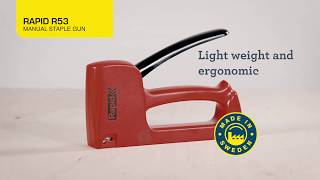 Let, brugervenlig hæftepistol til gør-det-selv-projekter eller lettere professionelle opgaver. Fremstillet i slidstærk, robust plastik. Håndværkere sætter især pris på effektiviteten, den lave vægt, holdbarheden og evnen til at klare regelmæssig brug. R53E er også egnet til personer med mindre hænder. Ideel til møbelpolstring, dekorationsarbejde med diverse tekstiltyper eller fastgøring af quilttæpper, plakater eller læder.