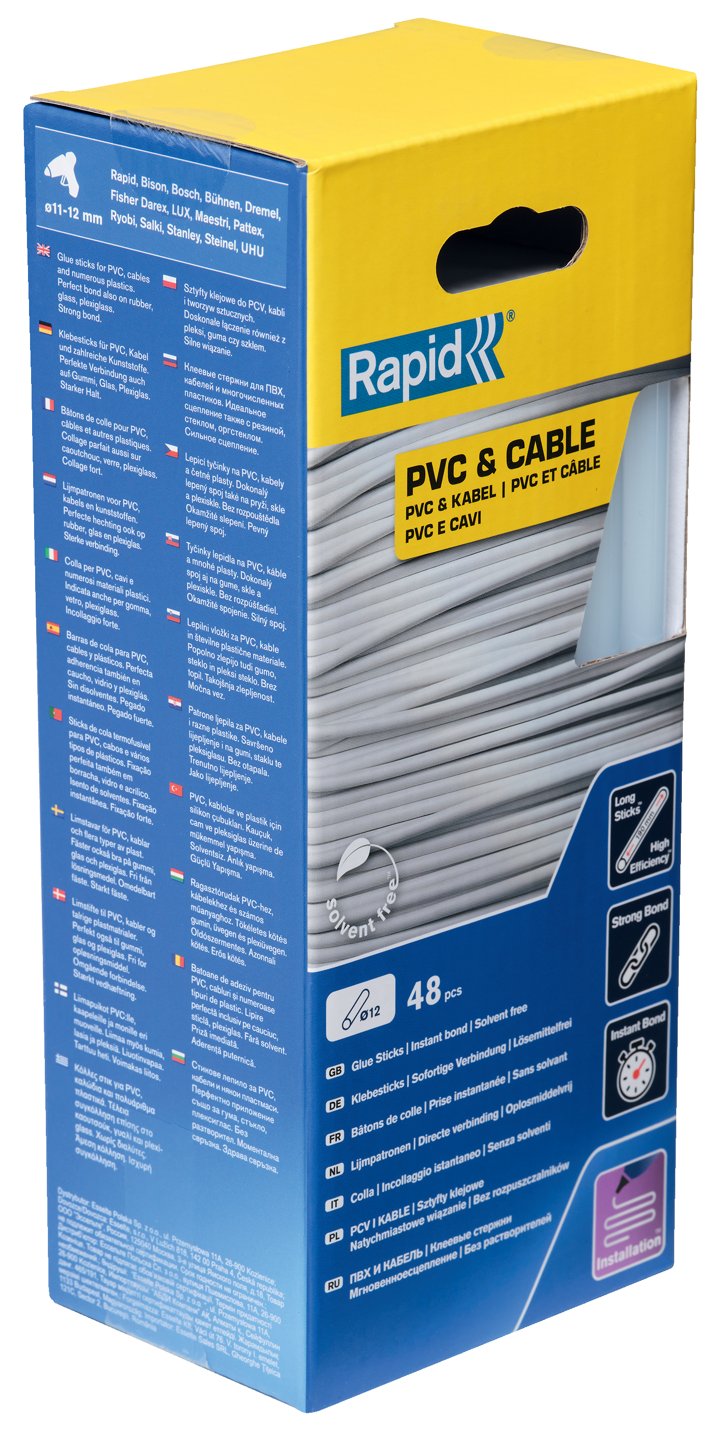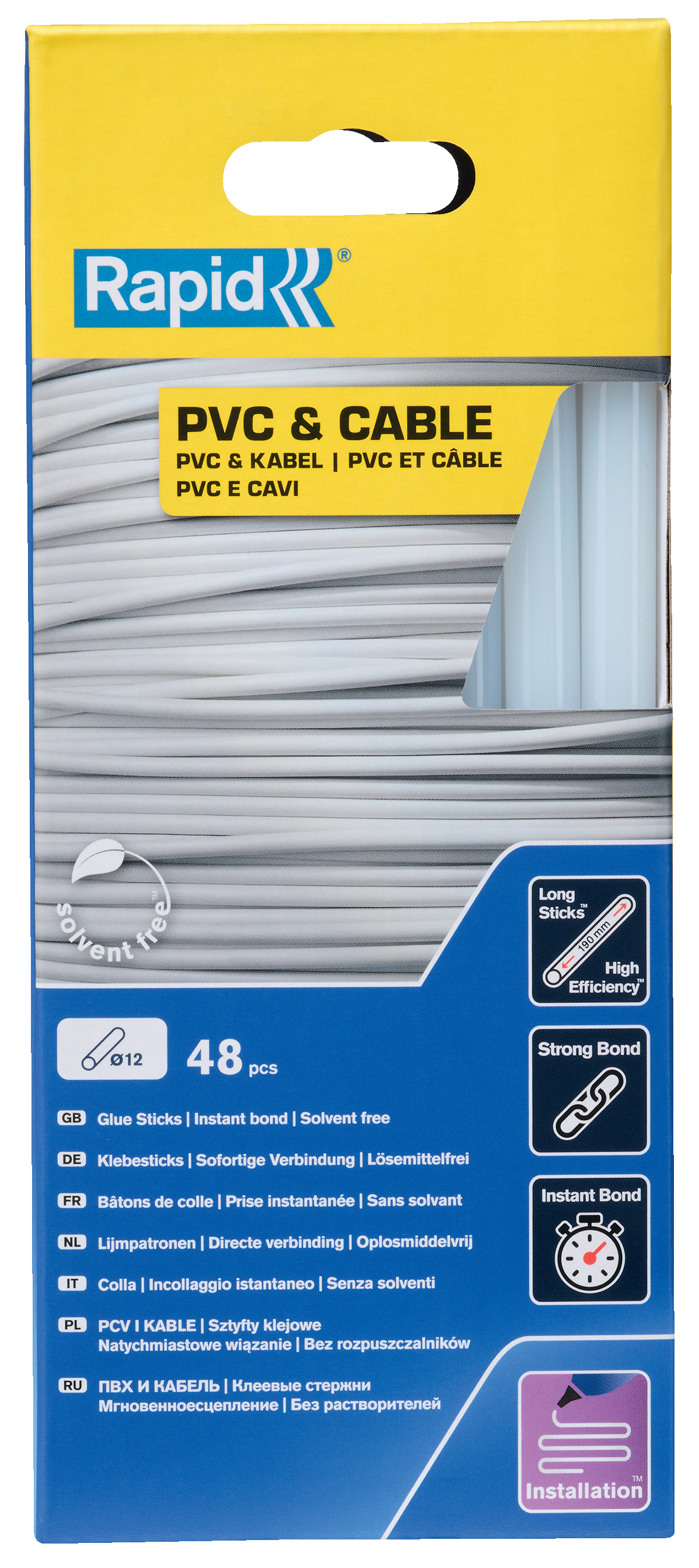 Disse 12 mm lim stave, leverer lim i en meget høj kvalitet, takket være det høje harpiks indhold. Perfekt til PVC, kabler og adskellige plastmaterialer, også god til gummi, glas, plexiglas. Perfekt til installations opgaver Pakken indeholder 48 lange lim stave.