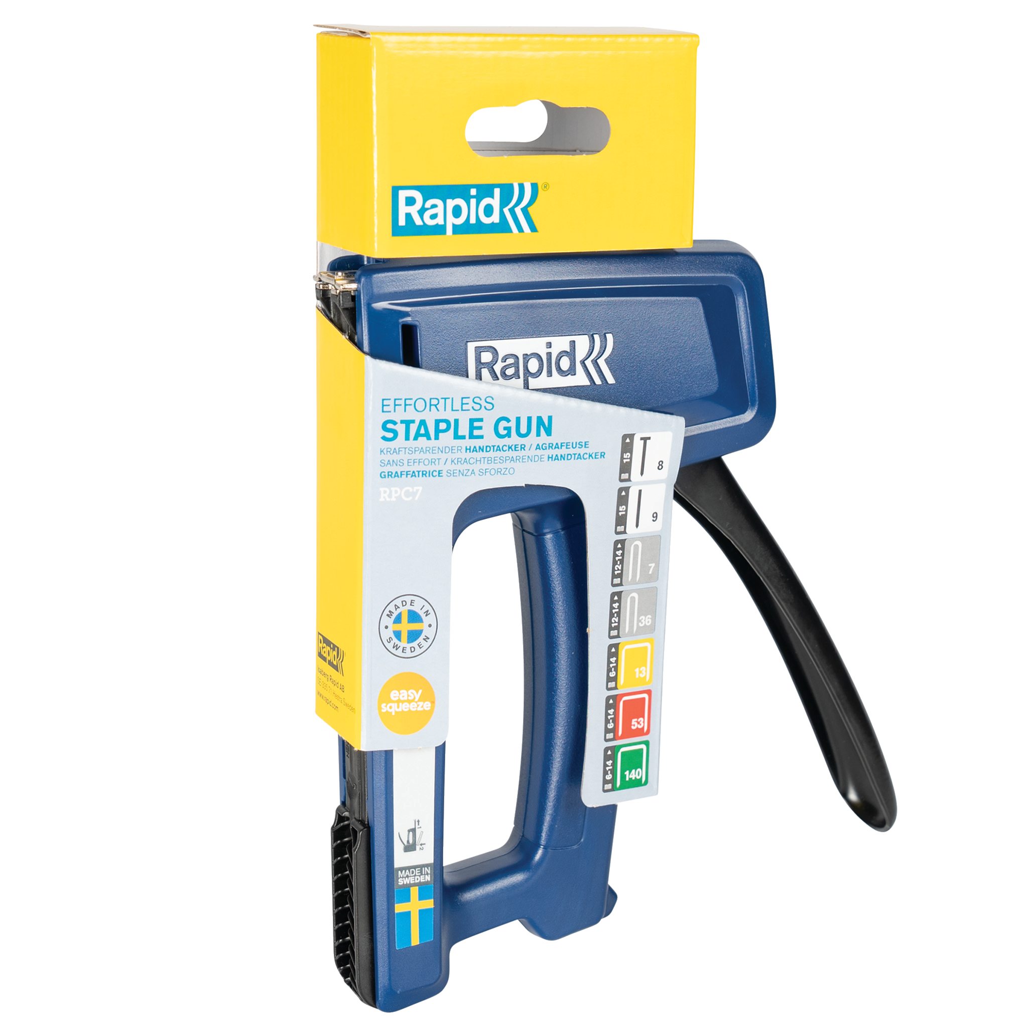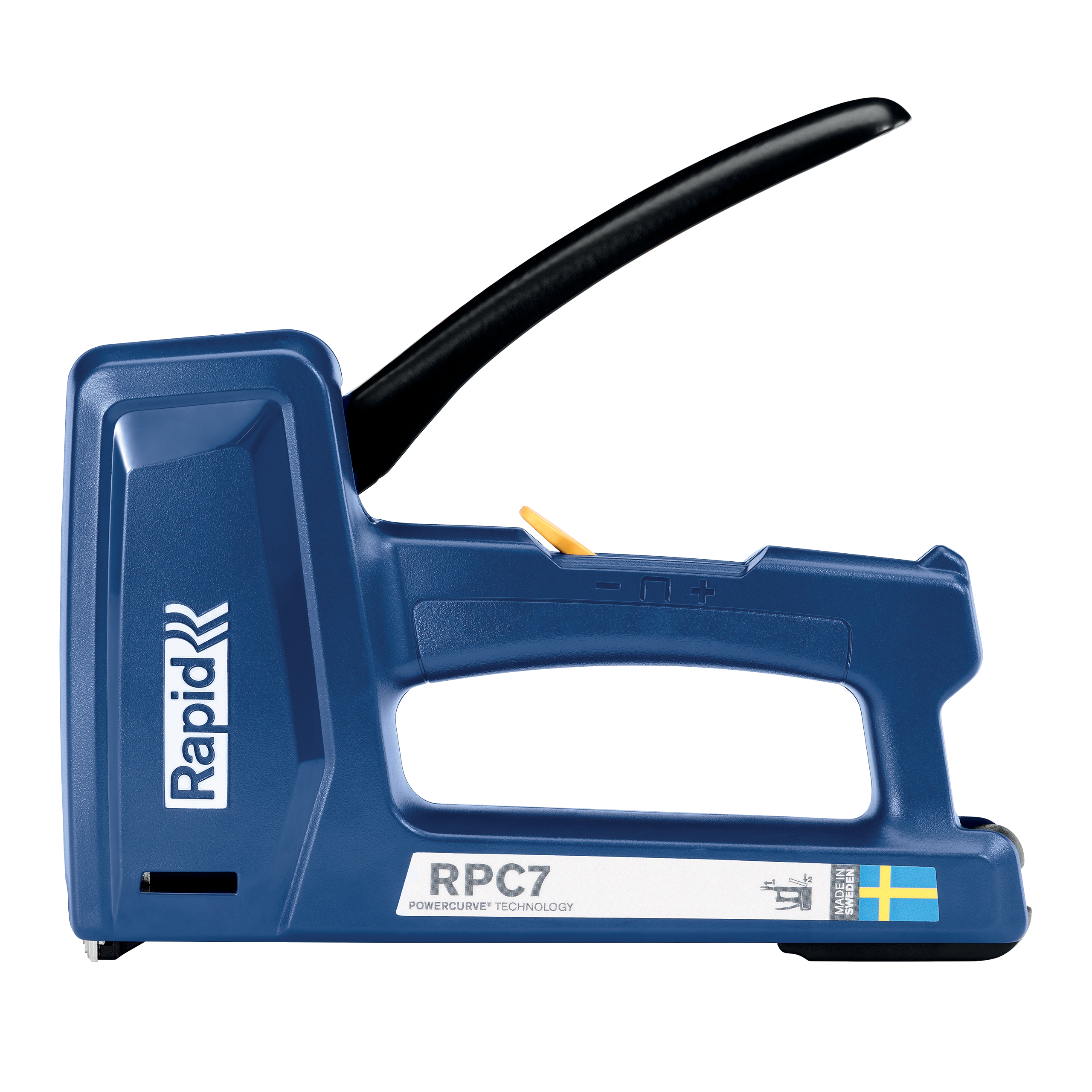 RPC7 kan fyldes med fintråd, fladtråd og kabelklammer, brad søm og stifter. Anvendelsesområderne for denne hæftepistol er derfor ekstremt mange: møbelpolstring, tynde træmaterialer, masonit, fugt- og dampspærrer, plastfolie, lavspændingskabler, hæftning af fine og tynde tekstilmaterialer og arbejde i haven, f.eks. børnenes kaninbur, og meget mere. Rapids unikke Powercurve-teknologi reducerer den kraft, der kræves for at hæfte, med op til 50 %. Det gør RPC7 til det rigtige værktøj til alt, hvad du foretager dig - komfortabel, hurtig og nem at arbejde med sammenlignet med traditionelle hæftepistoler. 2-trins kraftjusteringen hjælper dig med at optimere kraftbehovet afhængigt af hæftelængde og materiale. Den ergonomiske RPC7 er fremstillet i Sverige af slagfast ABS-plast, og arbejdsdelene er fremstillet af stål i topkvalitet.