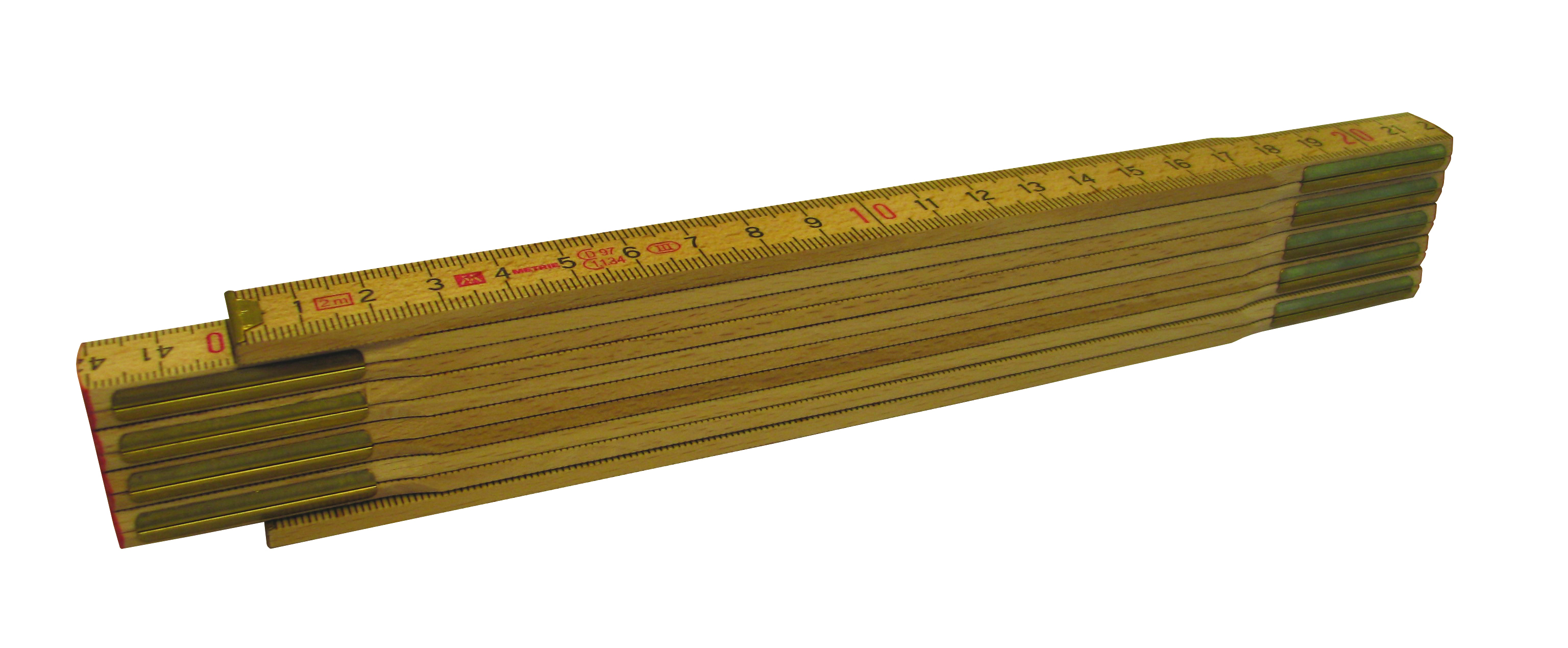 Tommestok lavet af bøgetræ, 2m, 10 sektioner, sektioner ca. 16mm bred, 3,3mm tyk, duplex millimeter graduering i sort med røde decimeter tal, slutter med beskyttende belægning i rødt. Led med skjult nitte sikre kontinuerlig læsbarhed af gradueringerne. Specielle led tillader tætte sektioner.