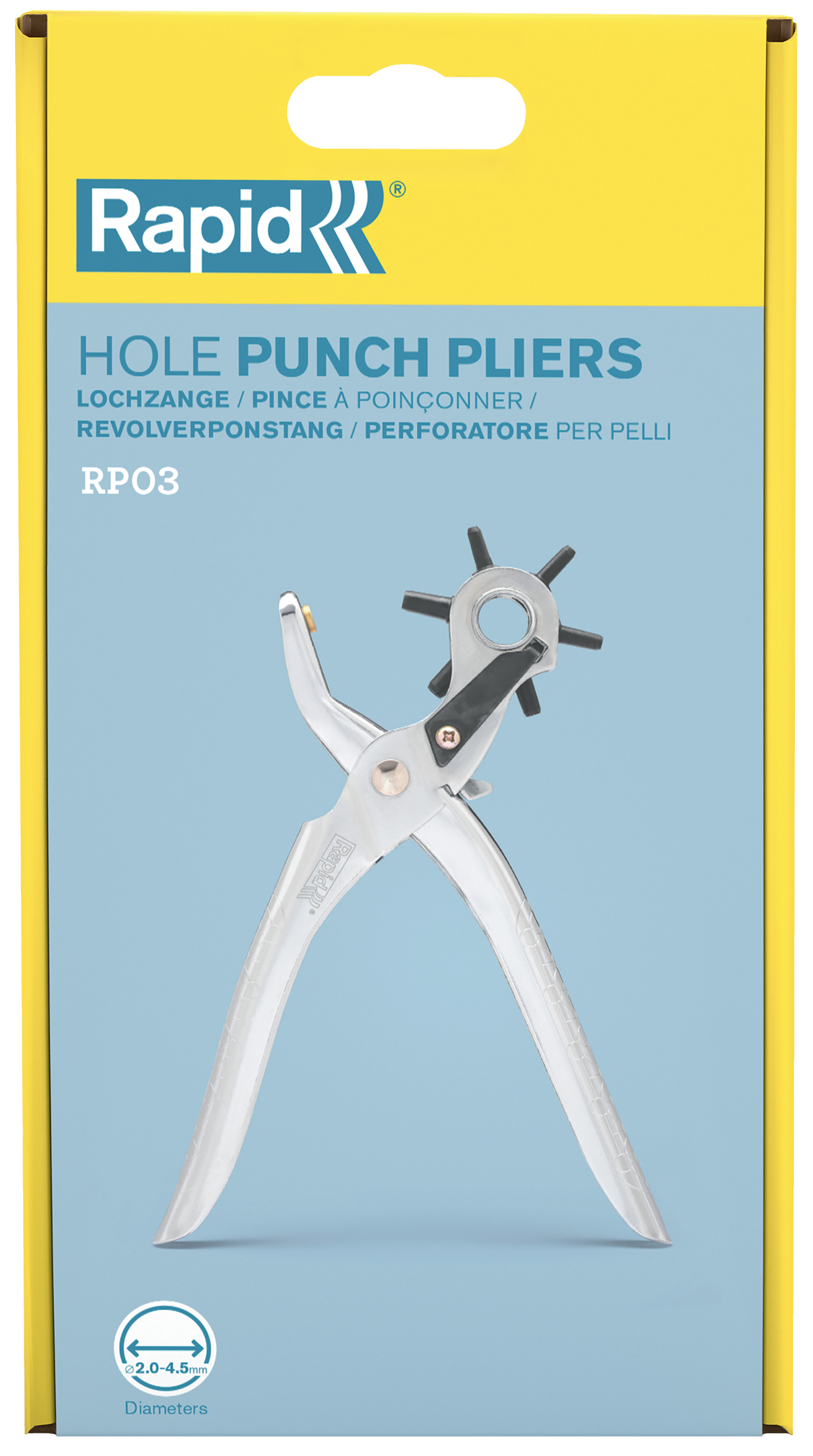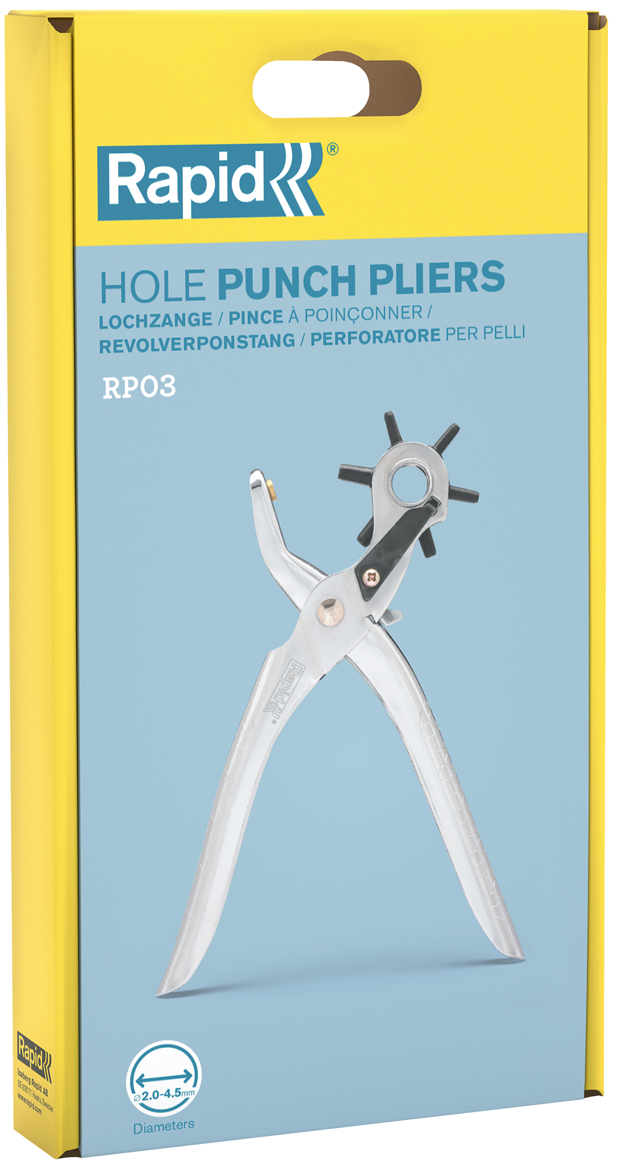 Alsidigt, prisrigtigt hultangsæt til læder, tekstil og plastik. RP03 er nem at håndtere, designet til hyppig brug og giver gode resultater. Det roterende hoved giver mulighed for hurtigt at vælge den korrekte diameter, og der kan laves huller på 2,5 til 4.5 mm. Har en flot finish i krom og stærke metaldele, som giver pålidelighed.