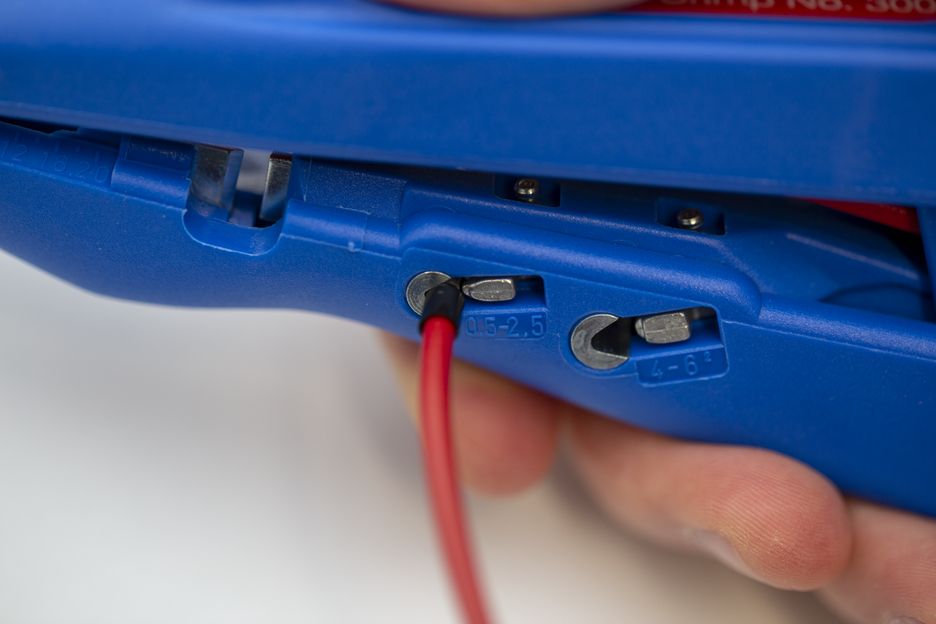 Afisolering og krympning med kun ét værktøj I Afisolering fra 0,5 mm² til 6,0 mm² I To krympeområder (0,5 - 2,5 mm² og 4,0 - 6,0 mm²) i henhold til DIN 46228-2 I Integreret, lettilgængelig sidebider op til 6 mm²