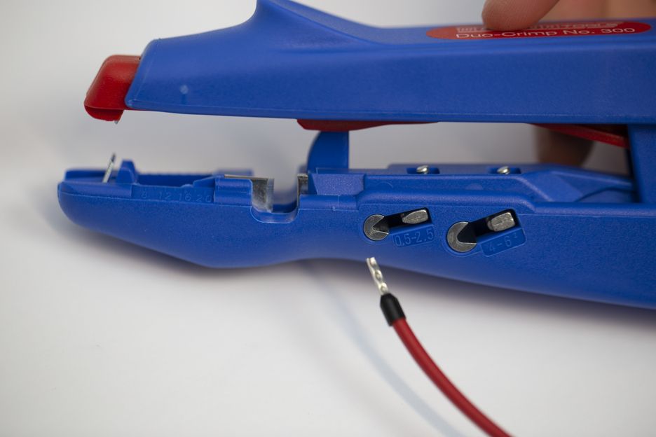 Med WEICON Duo-Crimp nr. 300 kan den bruges til at afisolere ledere og krympe endeterminaler. Med det automatiske scanningssystem er det ikke nødvendigt at justere kabeltværsnittet. Afisoleringstangen har en optisk længdeskala på 8-20 mm og er egnet til alle almindelige flertrådet og massive ledere fra 0,5 mm² - 6,0 mm². Duo-Crimp nr. 300 isolerer ledere op til en længde på 5 mm og forhindrer dermed, at de enkelte ledere splejses. Der tilbydes to krympeområder: 0,5-2,5 mm² og 4,0-6,0 mm². En lettilgængelig sidebider er integreret i værktøjet, som er egnet til kabeltværsnit op til 6 mm² (massive ledere op til 4 mm²).