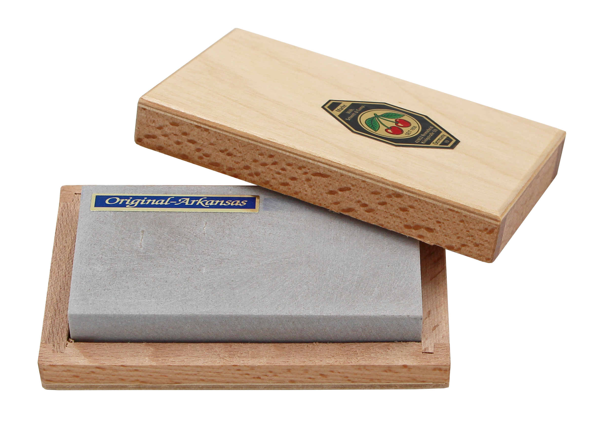 Natur arkansas hvæssesten i træ-æske. Oliesten til hurtig finslibning. Kan sammenlignes med korn 6000/8000.