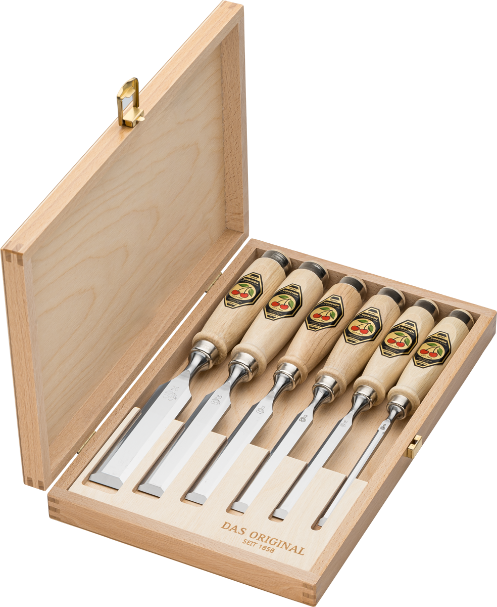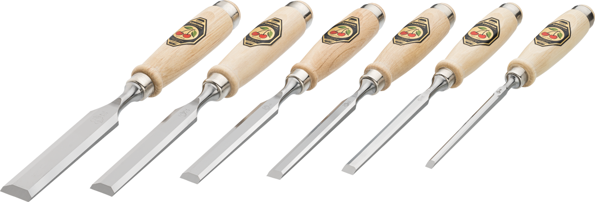 Stemmejernssæt af 6 dele med greb i avnbøg. Stemmejernene har korte længder og affasede kanter. Sættet indeholder:
