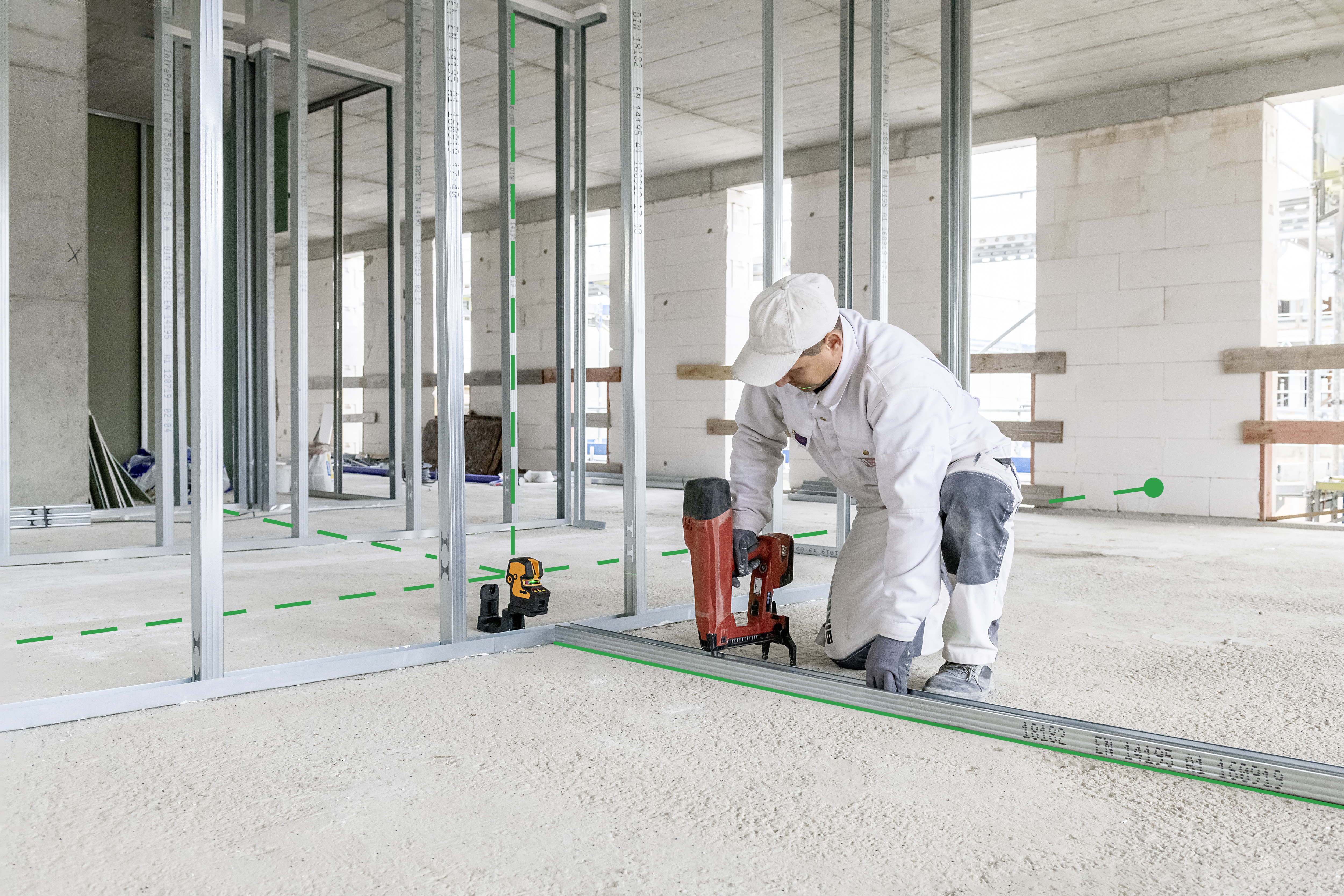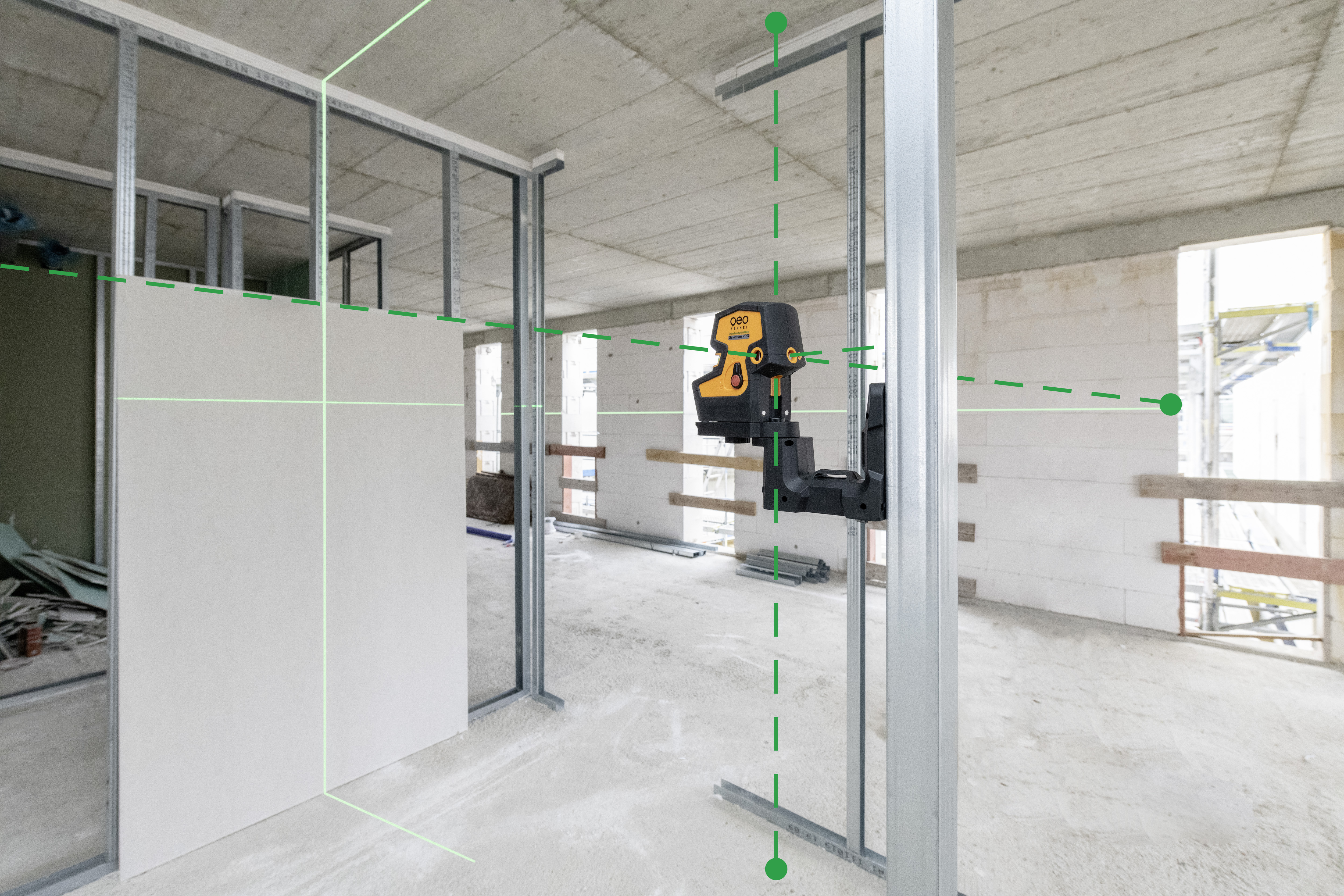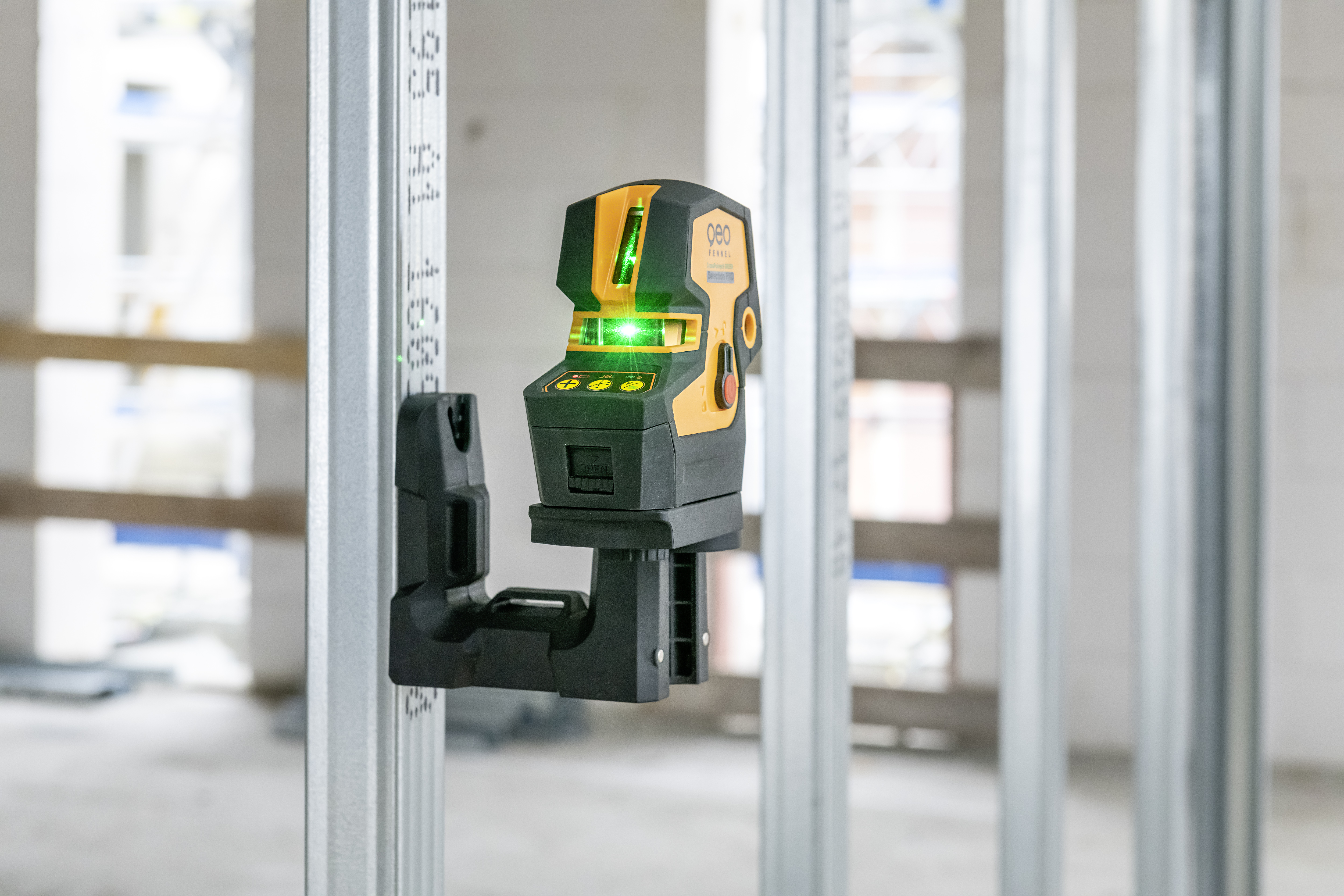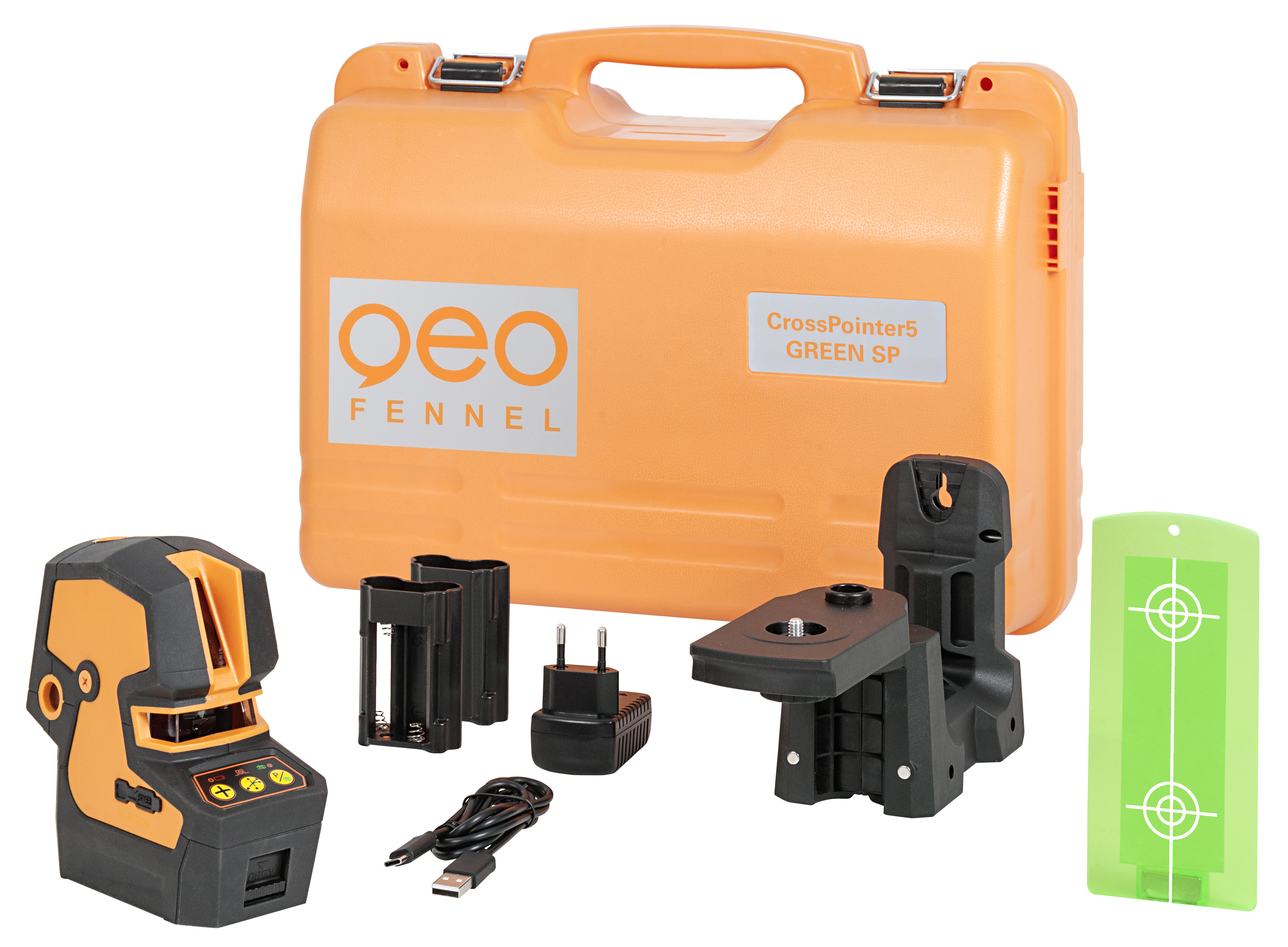 Grøn selvnivellerende prik-/krydslaser. 5-punktlaser: 1 prik ned, 1 op, 3 vandrette. Krydslaser: 1 vandret linje der dækker et område på 180° og 1 lodret linje der krydser det opadgående punkt og dækker et område på 160°. Velegnet til opsætning af skillevægge og forsænkede lofter, lodret overførsel af punkter, væg- og gulvfliser, almindeligt tømrerarbejde og 90° vinkling.