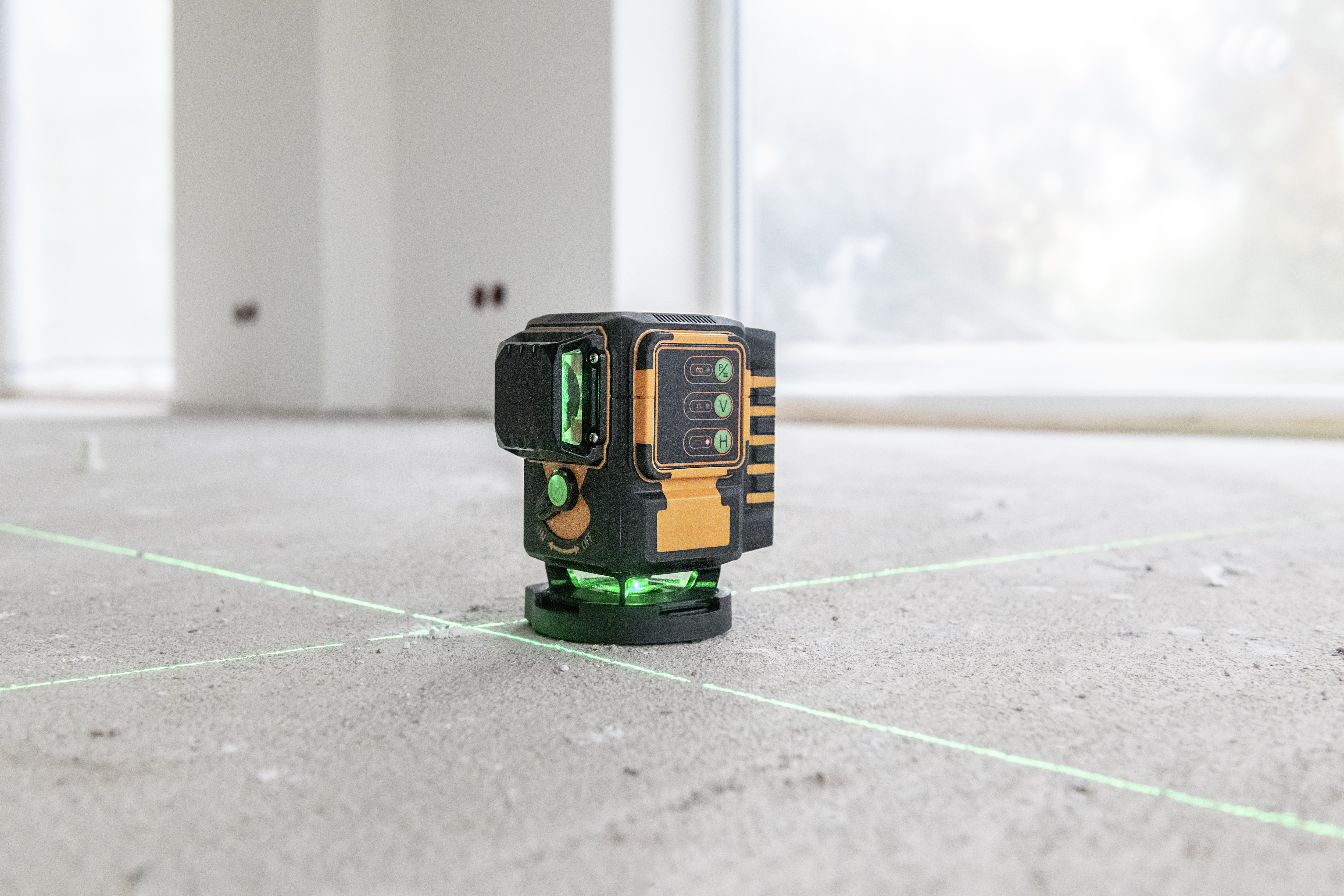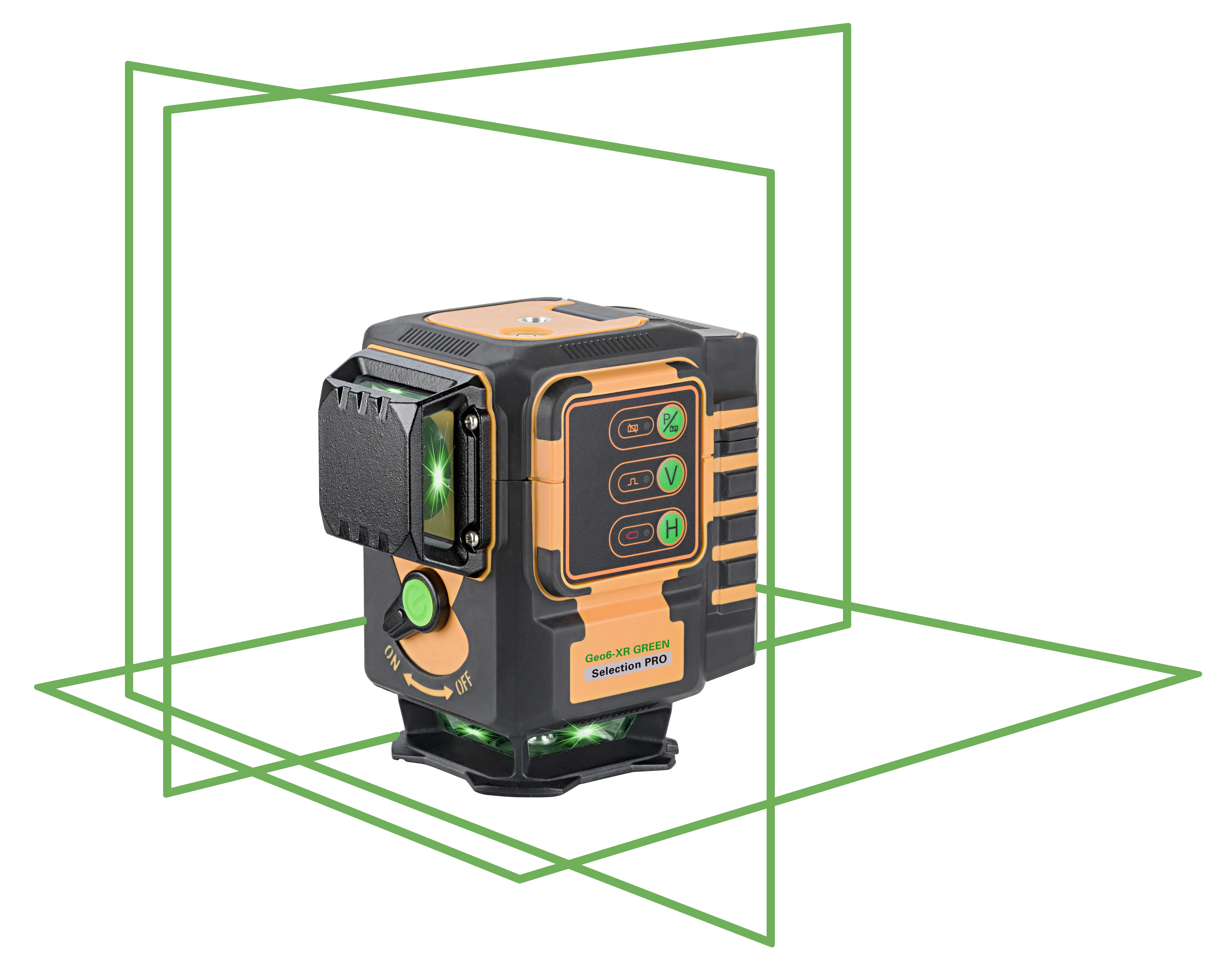 Grøn multi-linjelaser med 3 x 360° laserlinjer, som danner 6 laserkryds. Laseren er ideel til f.eks. fliselægnig, opsætning af fliser på vægge og opsætning af vægge, da den vandrette stråle kan komme meget tæt på underlaget og begge de lodrette stråler kan komme meget tæt på en væg.