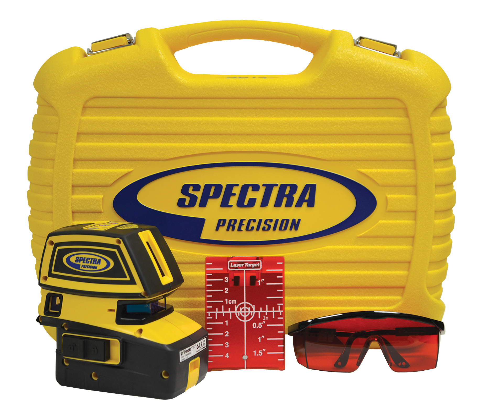 Spectra rød selvnivellerende prik-/krydslaser - gør det unødvendigt at eje både en priklaser og en krydslaser. 5-punktlaser: 1 prik ned, 1 op, 3 vandrette. Krydslaser: 1 vandret linje der dækker et område på 210° og 1 lodret linje der krydser det opadgående punkt.